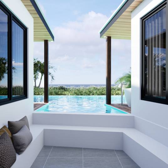 De patio’s zijn voorzien van een houten dek. De grote glazen schuifpuien creëren een ruim en open gevoel tussen de binnenruimtes en patio’s. Ook is er een zwembad met een lounge area om te genieten van het warme Caribische zon met een koele windje vanuit het noordoosten.