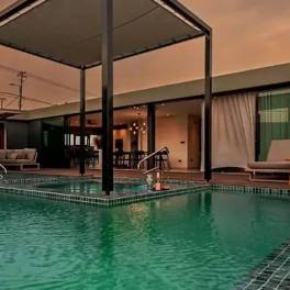 De open leefruimte vormt het hart van de woning, met een moderne, volledig uitgeruste keuken voorzien van hoogwaardige inbouwapparatuur, een kookeiland en veel werkruimte. Grote schuifpuien zorgen voor een naadloze overgang tussen binnen en buiten, waar een royaal terras, een privézwembad en een prachtig aangelegde tropische tuin op je wachten.