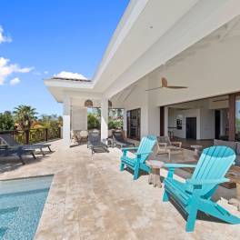 Via de royale hardhouten voordeur betreedt u een lichte entree die direct doorloopt naar de ruime living. Hoge plafonds en brede, glazen schuifpuien zorgen voor een naadloze verbinding tussen binnen en buiten. Uw blik valt als vanzelf op de overdekte veranda, het zwembad en het panoramische uitzicht richting Blue Bay en de glinsterende Caribische Zee.