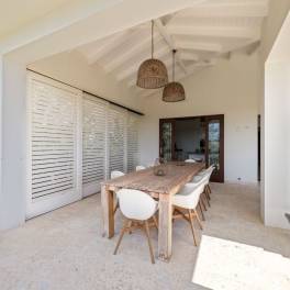 Rondom het terras liggen Coralina natuurstenen vloeren die zelfs op het heetst van de dag koel aanvoelen. Dit is tropisch wonen zoals het bedoeld is: veel licht, volop ventilatie en een vrije overgang tussen huis en tuin.