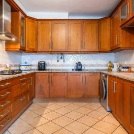 Keuken met eethoek: Praktisch en met toegang tot het terras en het zwembad, ideaal voor binnen of buiten eten.