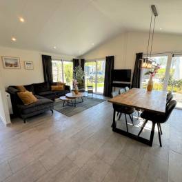De lichte living valt direct op door de vele grote raampartijen, waardoor u kunt genieten van natuurlijk licht en het unieke uitzicht. In deze open ruimte vindt u een gezellige loungehoek, een ruime eethoek en een moderne open keuken. De loungehoek is sfeervol ingericht met een ruime hoekbank, twee comfortabele fauteuils, een salontafel en een tv-meubel met televisie. De tv-zenders worden ontvangen via een CAI-aansluiting en er is WiFi aanwezig. Door de airco blijft het hier aangenaam vertoeven in de zomer.