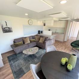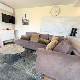 De woning is sfeervol en knus ingericht. Dit ziet u direct terug in de living. Hier zijn de loungehoek, de eethoek en de open keuken gesitueerd. Door de grote raampartijen geniet van veel natuurlijk lichtinval en prachtig uitzicht. De gezellige loungehoek is uitgerust met een ruime hoekbank, een fauteuil, een salontafel en een tv-meubel met daarboven een tv. De zenders hiervan worden ontvangen via een CAI-aansluiting en ook WiFi is geïnstalleerd.