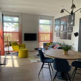 De schuifpui in de woonkamer leidt naar het zonnige terras, waar je kunt genieten van de loungeset, parasol en de tuinset, omringd door een mooie tuin. Voor extra gemak is er parkeerruimte voor 1 auto en gratis WiFi beschikbaar. De woning is voorzien van een inpandige berging.