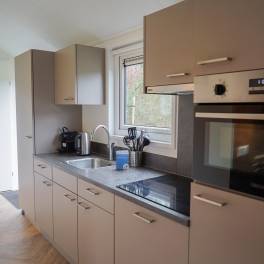 Het gevoel van rust en ruimte is ook van toepassing wanneer u de woning binnengaat. U komt direct in de grote living met open keuken die bestaat uit een keukenblok en alle benodigde keukenaccessoires. Dit laatste houdt in dat u beschikt over een kookplaat, afzuigkap, koel-vriescombinatie, vaatwasser, magnetron, oven en een kraan met daaronder een rvs spoelbak. Door de sfeervolle inrichting laat deze woning u thuis voelen. Deze ruimte is perfect om samen te komen met familie en/of vrienden. Door de aansluitingen voor de tv en het internet, is deze woning van alle gemakken voorzien.