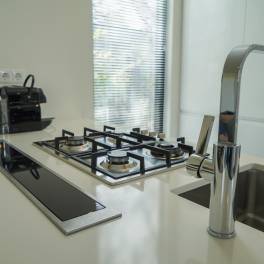 Het gevoel van rust en ruimte is ook van toepassing wanneer u de woning binnengaat. U komt direct in de grote living met open keuken die bestaat uit een keukenblok en alle benodigde keukenaccessoires. Dit laatste houdt in dat u beschikt over een kookplaat, afzuigkap, koel-vriescombinatie, vaatwasser, magnetron, oven en een kraan met daaronder een rvs spoelbak.