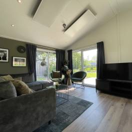 Op deze zonovergoten kavel ligt dit prachtig onderhouden Hackfort chalet. Dit vakantieverblijf biedt de nodige comfort voor een prettige vakantie met het gezin en/of vrienden. Wanneer u de woning betreedt, komt de zon u tegemoet. Dit komt door de grote raampartijen in de living. Dit zorgt ook nog eens voor een prachtig uitzicht. De living huist de loungehoek, de eethoek en de keuken. De ruimte is voorzien van een airco. De loungehoek is uitgerust met een hoekbank, twee fauteuils, een salontafel en een tv-meubel met een tv. De zenders hiervan worden ontvangen via een CAI-aansluiting en er is WiFi aanwezig. De eethoek is voorzien van een houten tafel en zes stoelen.
