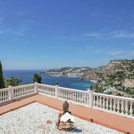 Cumbre Villas presenteert deze ruime villa te koop in Cotobro, Almuñécar, met een ontwerp op zes niveaus die verbonden zijn door trap en lift. Vanaf de entree, met twee garages en een berging, bereikt u twee tweepersoonsslaapkamers met en-suite badkamers en toegang tot buiten. Op de verdieping erboven is er een moderne open keuken die verbonden is met de eet- en woonkamer, met spectaculair zeezicht, gastentoilet en terras. De woning beschikt ook over een torentje met een slaapkamer en badkamer en een aangrenzend terras met uitzicht op zee en de omliggende bergen. Het zonnige zwembadgedeelte, eenvoudig bereikbaar, biedt een veelzijdige overdekte ruimte die ideaal is als gastenappartement, ontspanningsruimte of sociale club. Op het dak is er een terras met onovertroffen uitzicht, momenteel gebruikt als solarium en yogaruimte. Gelegen nabij het strand en goed verbonden met Málaga, Granada en de snelweg, biedt deze unieke villa veel potentieel met bevoorrecht uitzicht op zee en Marina del Este. Neem contact op met Cumbre Villas voor meer informatie of om een bezichtiging in te plannen.