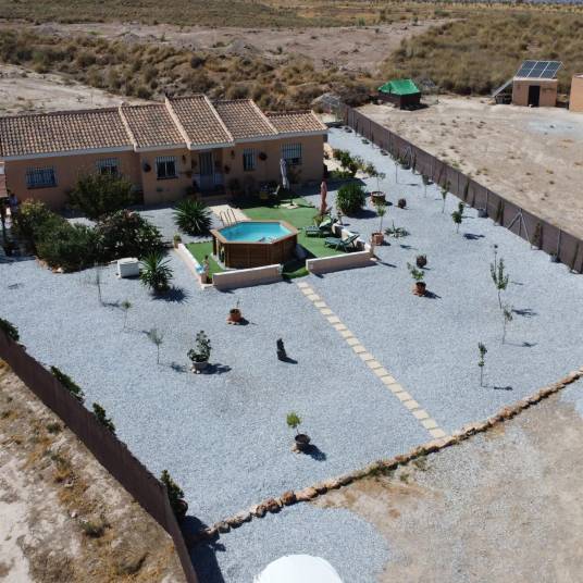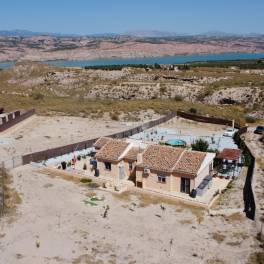 Spanish Country Villa (Bungalow Style) with Breathtaking Views at Lake Negratin – Only 10 Minutes from FreilaWelcome to The House by the Lake – a charming country villa that combines peace, privacy and panoramic views in a truly unique setting. Just 10 minutes from the picturesque village of Freila and only 3.5 km from Lake Negratin with its sandy beach, campsite, bar-restaurant, padel court and large outdoor swimming pool.This is the ideal place for nature lovers seeking both tranquility and convenience.This property is exclusively for sale with Ikzoekeenhuisinspanje.nl. This means it is only available through us and that all documents have been checked in advance and are either in order or can be made so.The PropertySet in a quiet, secluded location with no immediate neighbours, this bungalow offers the best of country living:• 3 spacious bedrooms – 2 with fitted wardrobes. The master bedroom includes air conditioning (hot/cold) and a private bathroom with bathtub and toilet.• 2 bathrooms in total – including one with a shower.• Practical kitchen – divided into two sections: a cooking area and a separate utility room with sink and washing machine, providing direct access to the rear terrace.• Bright, cosy living room – with pellet stove for warmth and atmosphere during cooler months, plus hot/cold air conditioning.Eco-Friendly Self-SufficientA newly installed solar power system with lithium batteries makes the property fully off-grid and energy-efficient, with minimal costs and a small ecological footprint. Wastewater is handled via a septic tank.Outdoor LivingThe fully fenced plot of over 5,500 m² is perfect for pets, gardening, or simply enjoying the outdoors in complete privacy.• Front terrace with above-ground pool – ideal for a refreshing dip.• Rear terrace with plunge pool and BBQ area – overlooking Lake Negratin and the surrounding hills.• Several seating areas – perfect for relaxing, dining, or just soaking up the views.Location SurroundingsThis property strikes the perfect balance between seclusion and accessibility:• Lake Negratin (3.5 km) – ideal for kayaking, swimming, fishing, or enjoying its quiet beaches.• Zújar hot springs – natural thermal baths, famous for their healing properties.• Freila (10 min) – a charming village with local shops, tapas bars and a friendly atmosphere.• Baza (20 km) – a lively town with Mercadona, Lidl, Carrefour, clothing and furniture shops, Baza hospital, weekly markets, cafés, restaurants and cultural highlights such as the Arab baths and the cathedral.This country villa is a true gem: complete privacy, sustainable living and panoramic views of one of Andalusia’s most beautiful lakes – all with amenities close by. Perfect as a family home or holiday retreat.