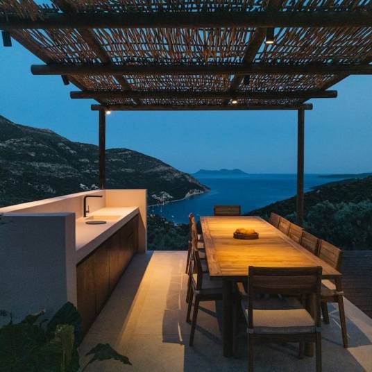 The outdoor area is equally impressive. A 17-meter-long infinity pool stretches towards the horizon, enhancing the sensation of being close to the water. The pool area is surrounded by sunny lounging areas and shaded, serene spots. A shaded living space and the outdoor dining area offer a central gathering point with amazing views of Poros Bay and the Ionian Sea, providing an ideal setting for unwinding and entertaining.