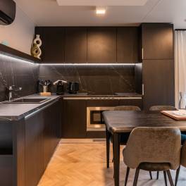 Das geräumige Wohnzimmer besticht aus mehreren Gründen: Es bietet eine große Sitzecke und eine schöne, L-förmige offene Küche. Diese ist mit einer Armatur und einem Edelstahlspülbecken, einem Geschirrspüler, einem Einbaukühlschrank mit Gefrierfach, einer Einbaumikrowelle und einer Dunstabzugshaube ausgestattet. Das Badezimmer verfügt über eine geräumige Dusche, ein WC und ein Waschbecken mit Handwaschbecken und Spiegel.