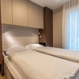 Qua interieur is de voornaamste blikvanger de master bedroom die niet alleen ruim is, maar ook verrijkt is met twee kasten naast elke zijde van het tweepersoonsbed. Hangkasten, een spiegel en haakjes om de jas op te hangen vergroten het comfort nog meer. Een schuifdeur verschaft bovendien rechtstreeks toegang tot het terras. De tweede slaapkamer bestaat uit twee eenpersoonsbedden met daartussen een nachtkastje. Een kledingkast, hangkasten en kledinghaakjes kleuren deze ruimte verder in.