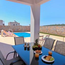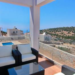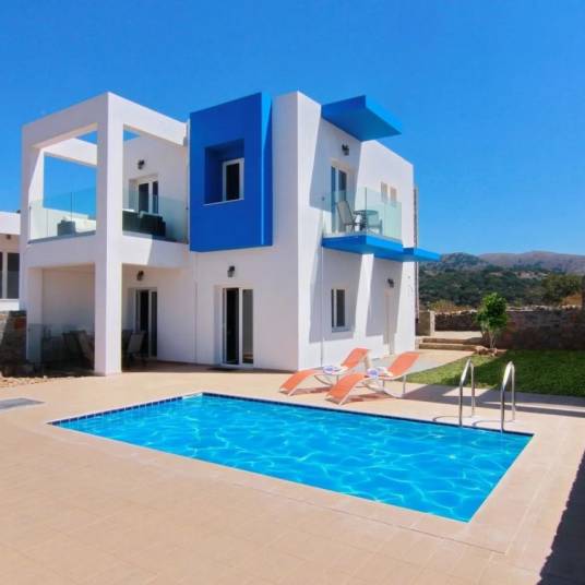 De begane grond bestaat uit een open keuken en woonkamer, evenals een badkamer. Toegang tot de buitenruimte van de tuin en het zwembad. Een interne trap leidt naar de eerste verdieping, waar de drie slaapkamers met hun badkamers zich bevinden. Een ruim terras met uitzicht op zee en de bergen, waar u kunt genieten van de prachtige zonsondergang.
