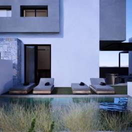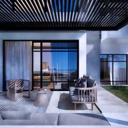 Op de begane grond van elk gebouw bevindt zich een woonruimte (woonkamer-keuken) van 40 m², 1 badkamer en 1 slaapkamer van 24 m² met privébadkamer. Op de eerste verdieping bevinden zich 2 extra slaapkamers, elk met een eigen balkon. In de buitenruimte van elke eenheid wordt een zwembad en een leefruimte gecreëerd, overschaduwd door een pergola.