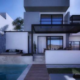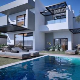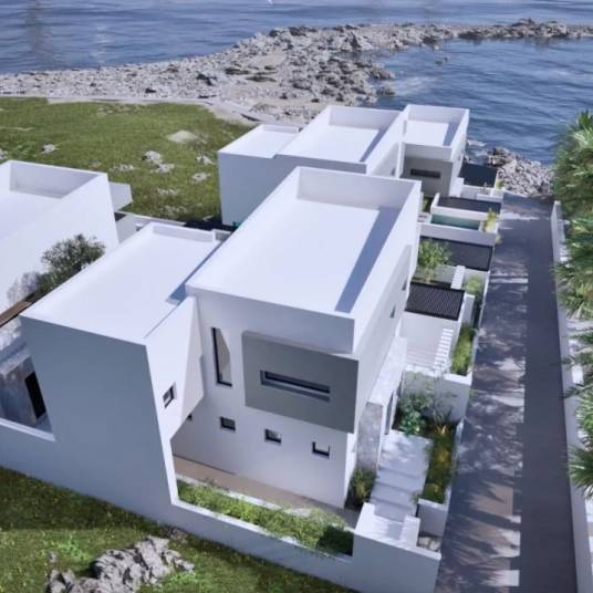 In de kustzone van de stad Sisi worden 4 luxe vakantiehuizen gebouwd, elk met een zwembad van 20 m² en een parkeerplaats, op een perceel van 956,81 m², met een onbelemmerd uitzicht op de zee.