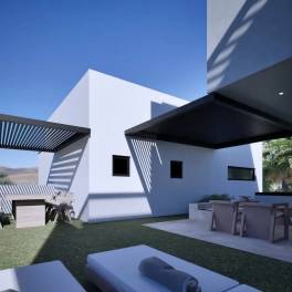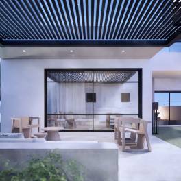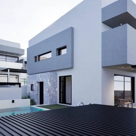 Op de begane grond van elk gebouw bevindt zich een woonruimte (woonkamer-keuken) van 40 m², 1 badkamer en 1 slaapkamer van 24 m² met privébadkamer. Op de eerste verdieping bevinden zich 2 extra slaapkamers, elk met een eigen open balkon. In de buitenruimte van elke eenheid wordt een zwembad en een leefruimte gecreëerd, overschaduwd door een pergola.