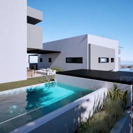 In de kustzone van de stad Sisi worden 4 luxe vakantiehuizen gebouwd, elk met een zwembad van 20 m² en een parkeerplaats, op een perceel van 956,81 m², met een onbelemmerd uitzicht op de zee.