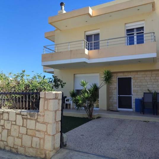 Deze mooie twee-onder-een-kapwoning ligt in een rustige buurt nabij Kato Gouves. De woning heeft een geschatte oppervlakte van 120 m² op een perceel van ongeveer 500 m².