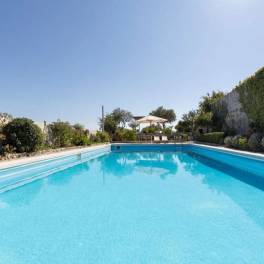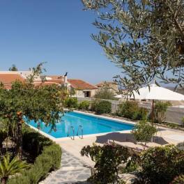 Het prachtige exterieur beschikt over een aangelegde tuin met een zwembad van 72 m², een binnenplaats van steen met een traditionele oven en een put. Er is parkeergelegenheid voor meerdere voertuigen en een elektrische poort. Het ligt op 9 km van de stranden van Karteros.