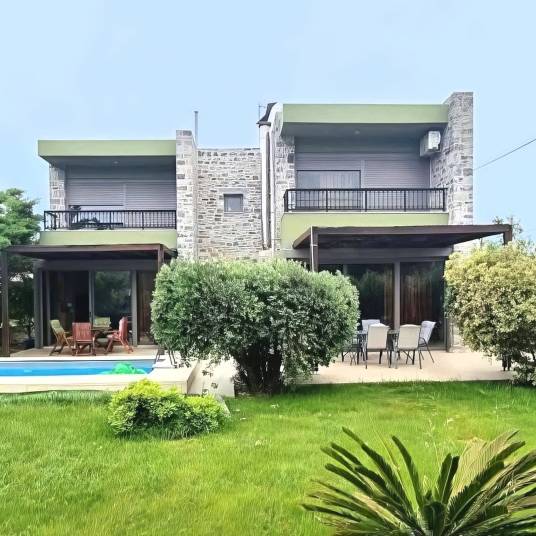 The ground floor features a spacious living and dining area with a fireplace, an open-plan kitchen, and a guest WC, creating a warm and welcoming atmosphere ideal for gatherings. An interior staircase leads to the first floor, where three comfortable bedrooms, a study room, and a luxurious bathroom with a jacuzzi offer both relaxation and functionality. Underfloor heating and A/C units will regulate temperature to the guests’ ideal settings, while all frames are aluminium and double-glazed. The property is secured by an alarm system and cameras, offering peace of mind in a setting of pure tranquillity.