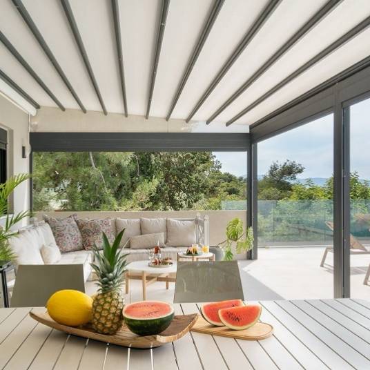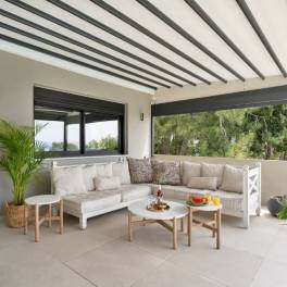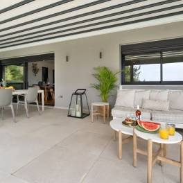 The main residence is thoughtfully designed to provide both style and comfort. It features four spacious bedrooms and two bathrooms. An open-plan living and dining area flows seamlessly into a sleek, fully equipped kitchen, where clean lines, premium appliances, and ample workspace create a perfect setting for both casual family meals and sophisticated entertaining. Large windows and sliding doors open directly to the outdoor terraces, blending indoor and outdoor living in true Mediterranean style.