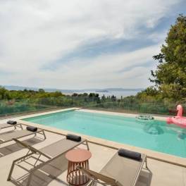 The outdoor areas are a true highlight of the property. A pristine swimming pool with glass-panel fencing provides uninterrupted views of the azure sea and surrounding landscapes. Multiple lounging areas, a shaded dining terrace, and landscaped gardens invite relaxation and alfresco gatherings, while the elevated position ensures peace and tranquility.