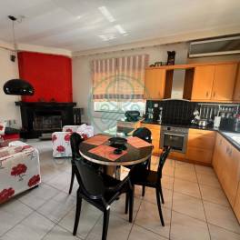Living room and kitchen with fireplace