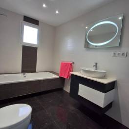 Aangrenzend aan de keuken is een kamer met wasmachine droger en voorraadkast. Vanuit deze ruimte komt u in een open patio waar u de was kunt drogen. De villa heeft 5 slaapkamers waarvan er 2 worden gebruikt als fitnessroom en één al dressingroom. Twee slaapkamers hebben hun eigen badkamer.