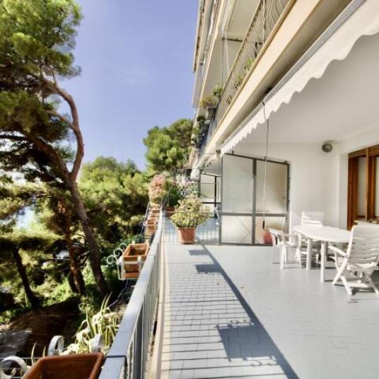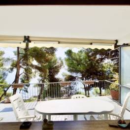 Het appartement bevindt zich op de begane grond en heeft 2 slaapkamers, een badkamer en een groot terras met uitzicht op zee van ongeveer 25 m2. Er is kleine aparte keuken en een grote woonkamer. Het complex heeft een portier en een grote omliggende tuin.