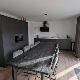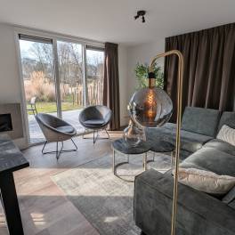 De open living voelt ruim en licht aan door de grote raampartijen, die zorgen voor een prachtig uitzicht over het strand en de plas. Hier vindt u een sfeervolle loungehoek met comfortabele zitbanken, een eethoek en een moderne open keuken. De keuken is volledig uitgerust met hoogwaardige inbouwapparatuur, waaronder een koel-vriescombinatie, combimagnetron, oven, vaatwasser en een inductiekookplaat met afzuigkap.