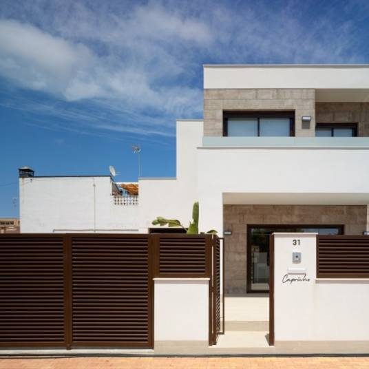 Marquanthouses biedt vrijstaande villas aan in San Pedro del Pinatar aan de Costa Cálida, Murcia. PROMOTIE VAN 6 LUXE HUIZEN IN SAN PEDRO DEL PINATAR VRIJSTAANDE LUXE HUIZEN. San Pedro is een mooie zeer gezellige kustplaats met lange fantastische stranden en is beroemd door de modderbaden en Spa gelegenheden. De villas zijn gelegen op een exclusieve plek in San Pedro del Pinatar, omringd door alle voorzieningen op slechts 2,9 km van de jachtclub en het strand. Er is veel zorg besteed voor elk detail, ruime, lichte ruimtes. Dit fantastische project uitgevoerd door prestigieuze architecten met internationale ervaring en met een team van specialisten in interieurontwerp, die hun magie gebruiken om het beste visuele en fysieke gebruik van de ruimte te maken, waardoor een unieke en persoonlijke sfeer in uw huis wordt gecreëerd, speciaal ontworpen voor u en uw gezin.Woningen met een woon-eetkamer-keuken geïntegreerd, met 3 en 4 slaapkamers, zijnde de master bedroom suite met kleedkamer inbegrepen, 3 badkamers, met gesloten onafhankelijke garage. Aanpasbare huizen. Optioneel zwembad. Optioneel meubelpakket.
