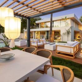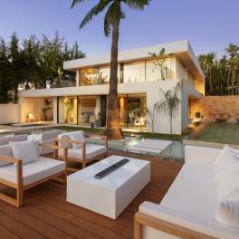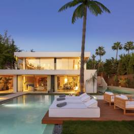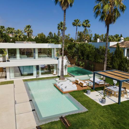 In het hart van Nueva Andalucía bevindt zich een uitzonderlijke moderne villa die stijl, luxe en comfort perfect combineert. Op een royaal perceel van 1.038 m² biedt de woning vier ruime slaapkamers en vier elegante badkamers, allemaal ontworpen met oog voor detail. De interieurs baden in natuurlijk licht dankzij de grote ramen van vloer tot plafond en benadrukken een verfijnd neutraal kleurenpalet, hoogwaardige afwerkingen en open leefruimtes die een warme en uitnodigende sfeer creëren. Binnen beschikt de villa over een ultramoderne keuken, een verfijnde eetkamer en een elegante lounge met eigentijdse architectonische lijnen en smaakvol interieur. De hoofdsuite is een waar toevluchtsoord met een spa-achtige badkamer en uitzicht op de aangelegde tuinen. Een bijzonder kenmerk is de naadloze overgang tussen binnen en buiten, met grote schuifdeuren die uitkomen op een privé-oase met een spectaculaire pool, weelderige tuin en stijlvolle chill-out zones, perfect om gasten te ontvangen of te ontspannen onder de mediterrane zon. Gelegen in een van de meest gewilde wijken van Marbella, bekend om zijn prestigieuze golfbanen, gastronomische restaurants, luxe boetieks en de nabijheid van Puerto Banús, is deze villa een zeldzame kans als woning of investering aan de Costa del Sol.