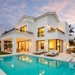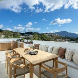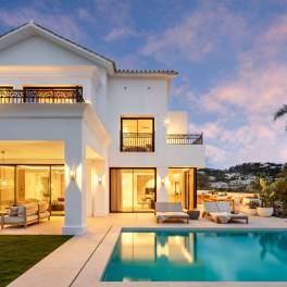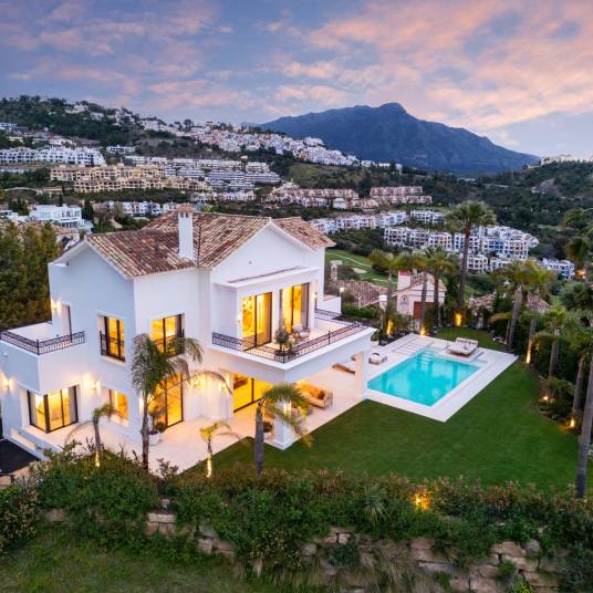 In Marbella bevindt zich een recent gerenoveerde luxe villa binnen een exclusieve gated community met spectaculair uitzicht over de golfbaan en de Middellandse Zee. Deze woning combineert mediterrane stijl met moderne elegantie en biedt een perfecte balans tussen comfort, privacy en verfijning. Met 972 m² bebouwd en een perceel van 1.016 m² beschikt de villa over lichte interieurs, ruime terrassen en prachtig aangelegde tuinen. Er zijn vijf slaapkamers met eigen badkamers en een extra gastentoilet. De begane grond is open van opzet met een stijlvolle woonkamer, Deense keuken met Gaggenau- en Siemens-apparatuur, Dekton-werkbladen, eetruimte en tv-lounge. Buiten zijn er zonneterrassen, barbecue, buitenfitness en een privézwembad van 50 m². De bovenverdieping biedt de mastersuite met inloopkast, luxe badkamer en privéterras met panoramisch uitzicht, plus twee extra slaapkamers en suite. De benedenverdieping is ontworpen voor ontspanning en entertainment, met bar, wijnkelder, bioscoop en garage met glazen wand. De villa heeft domotica Control4, Sonos-geluidssysteem, vloerverwarming en voorbereidende zonnepanelen. Hoogwaardige materialen en ambachtelijke afwerking creëren een luxe sfeer. Een unieke kans om modern mediterraan leven te ervaren met nabijheid van golfbanen, winkels en stranden.