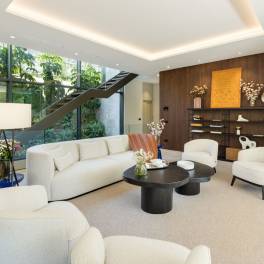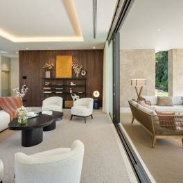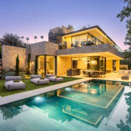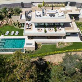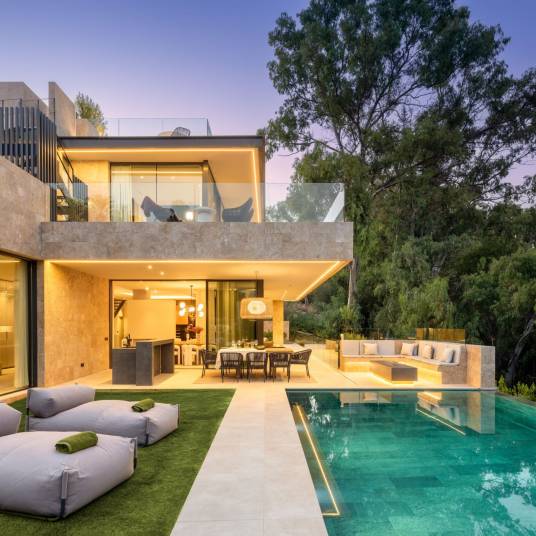 In La Cerquilla, een van de meest exclusieve wijken van Nueva Andalucía – Marbella, staat een moderne villa die duurzaam luxe wonen opnieuw definieert. Gebouwd in 2023 met natuurlijke materialen en innovatieve technologie, combineert de woning avant-gardistische architectuur met rust en elegantie. Met een totale oppervlakte van 921 m² over drie verdiepingen beschikt de villa over zes slaapkamers en zeven badkamers. De begane grond heeft een open indeling met woonkamer, Gaggenau-keuken, eetkamer, aparte tv-kamer en gastensuite. De terrassen leiden naar een buitenkeuken, eetgedeelte en zoutwater-infinitypool. De bovenverdieping biedt de mastersuite met inloopkast, badkamer met Villeroy & Boch- en Grohe-afwerking en twee extra slaapkamers met eigen badkamer. Op het dakterras bevinden zich jacuzzi, lounge, vuurplaats en voorbereiding voor een buitenkeuken. De kelder biedt gym, speelkamer, spa met sauna en hammam, tv-ruimte en twee slaapkamers. Dankzij domotica via app, zonnepanelen en vloerverwarming per zone is deze villa uiterst energiezuinig. Slechts 5 minuten van Las Brisas en Los Naranjos Golf en 10 minuten van het strand combineert dit huis technologie, comfort en een toplocatie in Marbella.