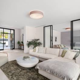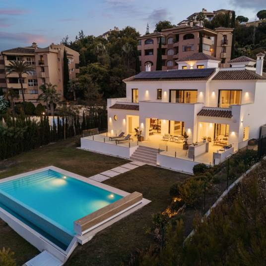 In de prestigieuze Santa María Golf urbanisatie in Elviria – Marbella ligt deze moderne villa aan de golfbaan die eigentijdse luxe combineert met een idyllische omgeving. Gebouwd in 2021 op een perceel van 1.743 m², biedt de woning 902 m² woonoppervlak inclusief 264 m² terrassen. Verdeeld over drie verdiepingen met lift, beschikt de villa over vijf slaapkamers met eigen badkamers, waarvan drie op hetzelfde niveau. Het gebruik van keramische steen en hout zorgt voor een warme en stijlvolle sfeer. De keuken is uitgerust met Miele-apparatuur; zonnepanelen, elektrische rolluiken en automatische irrigatie benadrukken het duurzame karakter. Elke verdieping heeft toegang tot terrassen met uitzicht op de golfbaan en de Middellandse Zee. Buiten bevinden zich een overdekt zwembad, sauna en barbecue. De woning beschikt over een alarmsysteem, beveiligde toegang en een garage voor drie auto’s. Op slechts vijf minuten van winkels en tien minuten van stranden en Nikki Beach, dichtbij de Duitse Internationale School en Santa María Golf & Country Club, biedt deze villa de perfecte mix van rust, ruimte en moderne luxe.