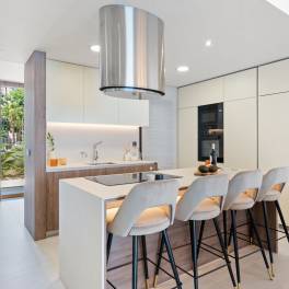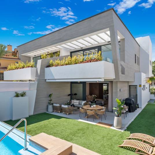 In Puerto Banús, Marbella, ligt dit moderne herenhuis dat luxe combineert met de mediterrane levensstijl, op slechts 150 meter van het strand. Gebouwd in 2021 in een beveiligde en exclusieve residentie, biedt de woning vier verdiepingen met vijf slaapkamers en vier badkamers over 265 m². Strakke architectuur en hoogwaardige afwerking creëren een elegant en comfortabel huis. Vloerverwarming op de begane grond en eerste verdieping zorgt voor comfort in elk seizoen. De kelder biedt ruimte voor een kantoor, gym of ontspanningsruimte en directe toegang tot de dubbele garage. Buiten is er een ruim terras, zwembad, jacuzzi en tuin met veel privacy. De residentie beschikt over 24-uursbeveiliging en onderhoud. Dicht bij luxe restaurants, designerwinkels, strandclubs, internationale scholen en golfbanen biedt dit huis de perfecte combinatie van stijl, locatie en comfort.