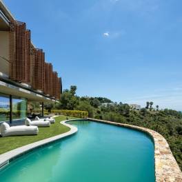 Gelegen in de prestigieuze, beveiligde wijk El Madroñal in Benahavís, biedt deze villa ultieme luxe en rust aan de Costa del Sol. De zuidwestelijke ligging zorgt voor panoramisch zee- en bergzicht, omlijst door aangelegde tuinen en privézwembaden.