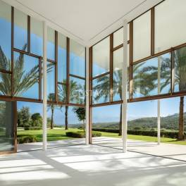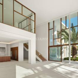 Bijzonder opvallend is de indrukwekkende plafondhoogte van maar liefst 9 meter in het woongedeelte op de begane grond. Een uniek kenmerk is het kleinere woongedeelte op de bovenste verdieping, dat een uitkijkpunt biedt over de leefruimte op de begane grond – een privévertrek, vergelijkbaar met een verborgen terras in het pand. De bovenste verdieping is gewijd aan de hoofdslaapkamer en twee gastenkamers, die elk hun eigen allure bieden met een prachtig uitzicht op de golfbaan en de Middellandse Zee.