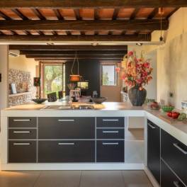 Het gehele huis is voorzien van op maat gemaakte meubelen, schilderijen en designverlichting. De woning is instapklaar, gemeubileerd en gestoffeerd. Het panoramisch zwembad met buitendouche ligt op enkele meters van het woonhuis en heeft een zeer ruim omliggend terras. Aan de zijkant van het huis is een inpandige garage (96 m²), gesitueerd in de heuvel.