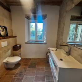 Op de eerste verdieping vindt u twee slaapkamers en een woonkamer met een originele open haard die een warme en gastvrije sfeer creëert. Een badkamer en een mezzanine/studeerkamer met nog een kleine ruimte completeren deze verdieping, welke uitkomt op de tuin en de pergola.