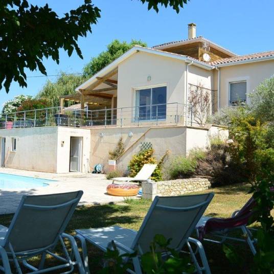 Onder architectuur gebouwde villa uit 2009 met uniek karakter en uitzonderlijke ligging met panoramisch uitzicht dat zich uitstrekt tot aan de majestueuze Pyreneeën. Gelegen op slechts vijf minuten van een levendig stadje en op korte afstand van een charmant dorpje met een school en een lokaal café; een perfecte balans tussen landelijke sereniteit en nabijheid van voorzieningen. Lichte en ruim interieur met prachtige open ruimtes die baden in natuurlijk licht. Volledig onafhankelijk, gelijkvloers appartement en een fraai zwembad met zonneterras. De villa ligt op een prachtig aangelegd terrein van 1,8 hectare met een olijfgaard van 100 bomen en zorgvuldig onderhouden vegetatie. Mooie aankom via eigen oprit.