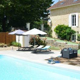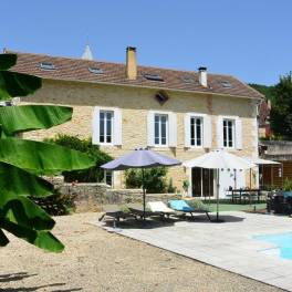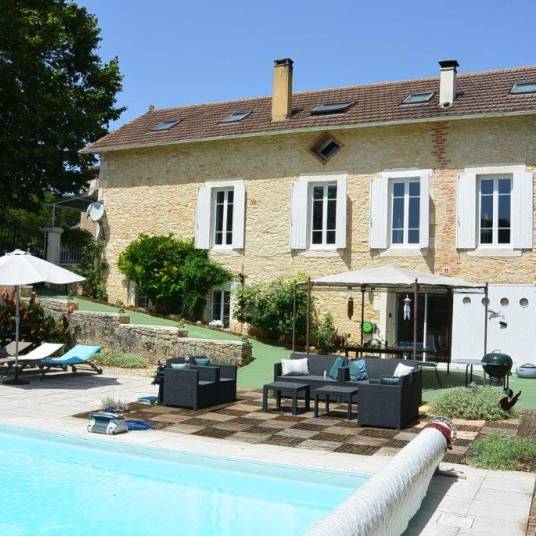 Indrukwekkend en royaal natuurstenen herenhuis in zeer goede staat, gelegen in een aantrekkelijk en rustig stadje niet ver van de rivier de Lot en op loopafstand van voorzieningen. Verrassend goede privacy met de omheinde en onderhoudsarme tuin van ca. 500 m² met oude bomen en een goed, verwarmd zwembad. Het pand is degelijk gerestaureerd met behoud van karakteristieke elementen met speelse, moderne touch.