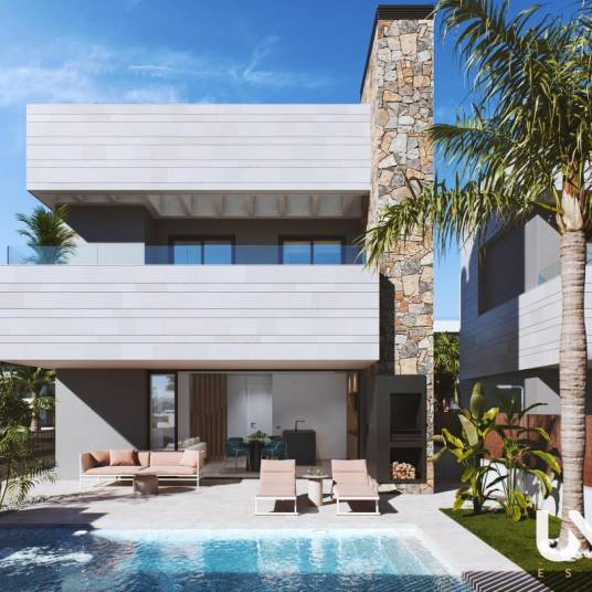 Met grote trots stellen wij deze unieke villa’s aan u voor, gelegen in het spectaculaire resort Santa Rosalía.Dit exclusieve resort bevindt zich aan de Middellandse Zee, meer bepaald aan de Costa Cálida ter hoogte van de Mar Menor. Het project omvat zowel villa’s als appartementen, allemaal gelegen in een oase van rust en natuur. De vele wandelpaden, sportfaciliteiten (waaronder golfmogelijkheden), speelzones en recreatieve gebieden bevinden zich rondom het centrale meer van maar liefst 16.000 m². Daarnaast beschikt het resort over een eigen ‘central park’ van maar liefst 124.000 m². Uiteraard mag ook de bijbehorende ‘beach club’ niet ontbreken binnen de totale oppervlakte van 700.000 m² waaruit het project bestaat.Dit type villa beschikt over drie slaapkamers en bevindt zich op uitstekende percelen van ongeveer 240 m², centraal gelegen in het unieke resort. Ze zijn ontworpen om het contact met de natuur binnen het domein maximaal tot zijn recht te laten komen.De villa’s bieden een leefruimte met open keuken, evenals een eerste slaapkamer en badkamer op het gelijkvloers. De leefruimte sluit naadloos aan op de prachtig aangelegde tuin met royaal terras en oprit voor een wagen (met mogelijkheid tot het voorzien van een laadpunt voor een elektrische wagen). Op de eerste verdieping bevinden zich de tweede en derde slaapkamer, elk met een ensuite badkamer, en is er toegang tot een ruim zonneterras.Nog ruimte nodig? De polyvalente onderbouw van maar liefst 108 m² biedt een waaier aan mogelijkheden.Standaard zijn de villa’s uitgerust met een ruim solarium en zwembad, een verlichtingspakket met LED-verlichting, vloerverwarming in de badkamer en een pré-installatie voor airconditioning. Uw droomwoning dat realiteit wordt binnenkort? Vraag vrijblijvend meer informatie!