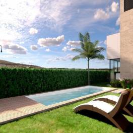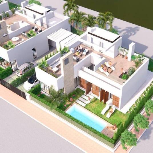 Luxurious complex of 4 detached villas, each featuring an individual swimming pool, an open plan basement with natural light and ventilation through an English patio, and a solarium. Situated on plots of approximately 400m², these villas offer modern living with high-end amenities.VILLA 2: 406 sqm plot, 140 sqm built, 144 sqm basement, 105 sqm garden, 26 sqm terrace 1, 24 sqm terrace 2 and 93 sqm solariumFURNITURE CHEQUE AS A COURTESY – worth 15.000 eurPlot Size: 406m²Build Size: 140m²Swimming Pool 7×3Summer kitchenInterior Features:Motorized aluminum blinds in bedroomsWhite kitchen furniture with Silestone countertops and backsplashIntegrated appliances: refrigerator, induction hob, built-in extractor, column oven, microwave, and dishwasherA unique project in Costa Cálida.This new project offers beautiful homes around an artificial lake of 16,000 square meters, with a beach and all facilities: green areas, children’s playgrounds, mini golf, sports facilities, and a Beach club.Santa Rosalia Resort – Welcome to joyfulness!This innovative resort combines a superb location and a unique concept in project development.LocationSanta Rosalia lies just four kilometers from the beaches of the Mar Menor, near the charming town of Los Alcazares in the Region of Murcia. The area is famed for its authentic Spanish character, charming seaside towns, and many golf courses. The historic city of Cartagena is just 15 minutes by car. The nearest airport is just 15 minutes away. Alicante airport is less than an hour by car.SustainabilitySanta Rosalia is a resort with a large commitment to sustainability and the future. Every aspect of the resort is planned with the greatest sustainability in mind, from the energy rating of the homes to the landscaping and the central La Reserva area.PropertiesThe resort offers a full range of Properties, from apartments to detached villas with private swimming pools. The first homes will be completed in late 2022. The total construction time of all 1.300 homes is five years.La ReservaThe homes as Santa Rosalia are built around La Reserva, a huge green central space designed and created for all residents to enjoy:Crystal clear lake of 16.000 square meters, with tropical beach bar000 square meters of beachBeach club with bar, restaurant, supermarket, gymnasium, and business centerCrazy golfFrisbee golf areaSports area with open-air gym/calisthenics areaForest area to enjoy family quality time, with fixed barbecue pitsCycle paths throughout the resortPlay parks for childrenWalking route for a gentle strollCrystal Lagoons technology.The lake will provide an outstanding experience for residents.This will be the largest man-made lake in Europe. The Crystal Lagoons technology is a world-leading filtration system for lakes and lagoons for bathing.The technology ensures the most efficient and sustainable use of water;it uses half of the water normally required for a feature of this sizeit requires 100 times fewer chemicals than a conventional swimming pool andit consumes 50 times less energy than a conventional pool