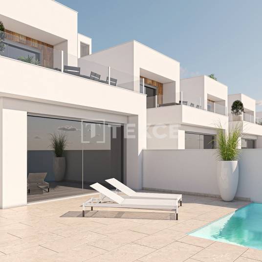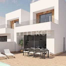 Moderne Villa’s met 3 Slaapkamers en Zwembaden in San Pedro del PinatarDeze eigentijdse villa’s bevinden zich in het rustige en gewilde stadje San Pedro del Pinatar, dat bekendstaat om zijn mediterrane charme en ontspannen kustleven. Het gebied combineert perfect de rust van een omgeving aan zee met het gemak van nabijgelegen winkels, restaurants en vrijetijdsvoorzieningen. Met zijn beroemde zoutmeren, natuurparken en vriendelijke gemeenschap biedt San Pedro del Pinatar een ideale balans tussen natuur en modern wonen.Vanaf deze villa’s in San Pedro del Pinatar te koop ligt het strand van de Mar Menor op slechts 3,5 km, met kalm en ondiep water dat ideaal is voor gezinnen. De schilderachtige fietsroutes van Las Salinas liggen op ongeveer 6 km afstand en zijn perfect voor buitenactiviteiten. De Marina de las Salinas ligt op circa 6,2 km en biedt eetgelegenheden en aangename wandelingen langs het water. Het centrum van San Javier ligt op ongeveer 8 km, terwijl golfbanen zoals Roda Golf & Beach Resort op circa 10 km afstand liggen. Cartagena ligt op ongeveer 35 km en de luchthaven van Murcia op 38 km, wat zorgt voor goede regionale bereikbaarheid. De omgeving is zorgvuldig ontworpen voor zowel permanente bewoners als vakantiewoningbezitters, met rustige straten en uitstekende toegankelijkheid.De villa’s zijn gebouwd op individuele percelen vanaf 153,93 m², waardoor privacy en ruime buitenleefruimtes worden geboden. Elke villa beschikt over een privézwembad, een tuin en een overdekte parkeerplaats.Binnen beschikken de villa’s over een modern open indelingsconcept, waarbij de woon-, eet- en keukenzones naadloos aansluiten op het buitenterras. Elke villa heeft drie slaapkamers en twee elegante badkamers, met eigentijdse afwerkingen en materialen van hoge kwaliteit. Grote ramen laten veel natuurlijk licht binnen en creëren een heldere, uitnodigende sfeer die ideaal is voor modern mediterraan wonen. RMU-00291