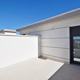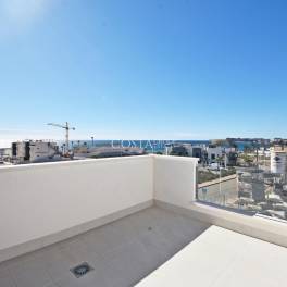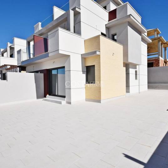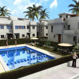 Elke villa heeft een bebouwde oppervlakte van 101 m² op een hoekperceel van 126 m², verdeeld over twee verdiepingen plus een solarium. Op de begane grond vindt u een lichte woonkamer, een aparte keuken met toegang tot de achterzijde van het perceel, een tweepersoonsslaapkamer en een complete badkamer. De eerste verdieping beschikt over twee slaapkamers, één met toegang tot twee terrassen met vrij uitzicht en de andere met een eigen badkamer, plus een extra familiebadkamer. De bovenste verdieping is gewijd aan een privésolarium van 31 m² met een prachtig uitzicht op zee, perfect om te zonnebaden, buiten te eten of te ontspannen met vrienden.