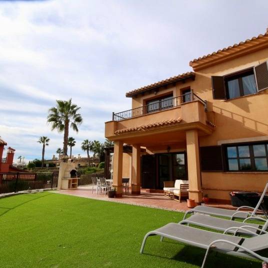 Beautiful3-bedroom, 3-bathroom 2-storey corner, semi-detached villa with community poolat Hacienda del Álamo Golf Resort. Extra-large plot.The villais maintained to a high standard.Theexterior of the property provides a great space to enjoy the sun and shade.This is a lovely big plot with direct access to a large community poolThe largeporch opens up to an open-plan lounge, dining area and completely modernkitchen.There aretwo bedrooms downstairs, one with en-suite and a guest bathroom. Stairs lead tothe main bedroom with en-suite and 2 balconies.3-bedroom,3-bathroom 2-storey semi-detached villafurnishedLargecorner plot – 367 sqm164 sqmconstructionLargeprivate garden 450m2Attractivelounge & dining roomWood burnerCompletelymodern fitted kitchen with all the white goodsMarble floorsLarge communal garden and pool