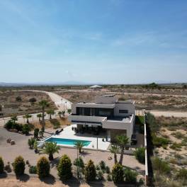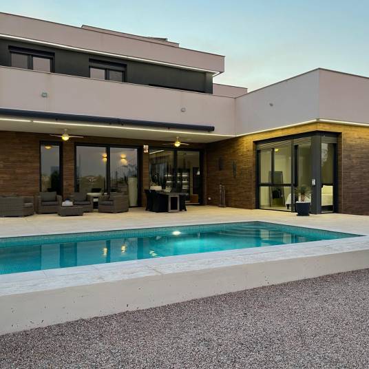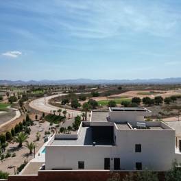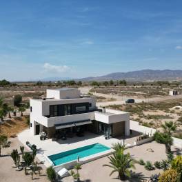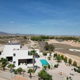 Deze exclusieve, luxe villa aan de golfbaan is gelegen op een royaal hoekperceel van 1157 m² en biedt een ongeëvenaard uitzicht op de heuvels, de golfbaan, het meer en het resort. Recent gebouwd en tot in de puntjes afgewerkt, is deze woning instapklaar en ideaal voor wie op zoek is naar een combinatie van comfort en luxe.Bij binnenkomst via de elektrische poort betreed je een prachtig aangelegde voortuin die leidt naar de hoofdingang van de villa. Aan de rechterkant vind je twee ruime slaapkamers met een moderne, gedeelde badkamer. Beide slaapkamers bieden toegang tot een groot dakterras, waar je kunt genieten van een indrukwekkend 360-graden uitzicht.Aan de linkerkant van de entree bevindt zich een dubbele garage en een studeerkamer met uitzicht op de golfbaan, perfect voor een rustige werkomgeving. Wanneer je de trap afdaalt, kom je in de royale woon-eetkamer, verbonden met een luxe, open keuken van Italiaans design. Deze keuken van maar liefst 71 m² is voorzien van hoogwaardige apparatuur en heeft schuifdeuren naar de tuin, wat zorgt voor een perfecte binnen-buiten leefervaring.Grenzend aan de keuken vind je een extra grote slaapkamer die toegang biedt tot een overdekt terras met barbecue, een moderne doucheruimte en een praktische bijkeuken. De master bedroom is een oase van rust met een en-suite badkamer en een ruime inloopkast. Vanuit deze kamer kijk je direct uit op het zwembad en de groene tuin.Buiten biedt de villa alles voor ontspanning en vermaak: een schitterend zoutwaterzwembad, omringd door tropische planten zoals cactussen en palmbomen. De overdekte veranda is ideaal voor lange avonden met vrienden of om te ontspannen na een dag op de golfbaan. Daarnaast beschikt de tuin over een extra toilet dat toegankelijk is vanuit de buitenruimte.Extra voorzieningen zijn onder andere elektrische rolluiken, zonnepanelen, een energiezuinige airconditioning met zonesysteem, energielabel A, alarmsysteem, pelletkachel en witgoed. De woning wordt volledig gemeubileerd verkocht, met uitzondering van enkele persoonlijke bezittingen.De villa ligt op slechts 3 kilometer van Fuente Álamo, 15 minuten van de luchthaven van Corvera en 30 minuten van de steden Murcia en Cartagena, waardoor het de perfecte locatie biedt voor wie zowel rust als bereikbaarheid zoekt.Een woning als deze moet je echt ervaren. Neem contact met ons op voor een bezichtiging en laat je verrassen door de luxe en de ruimte die deze villa te bieden heeft.