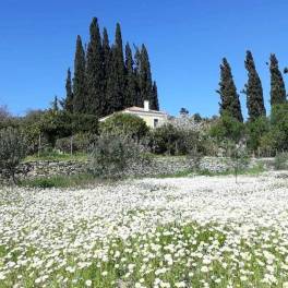 Het geheel is gelegen op een perceel van 20.000 m², rijk beplant met sinaasappelbomen, olijfbomen en diverse andere fruitbomen, wat een gevoel van rust, privacy en verbondenheid met de natuur creëert.