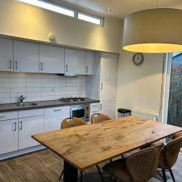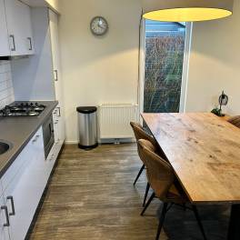 De eethoek is ingekleurd met een houten eettafel en vier stoelen. Deze staat in directe verbinding met de nette open keuken. De keuken is uitgevoerd met een koel-vriescombinatie, een combimagnetron, een vaatwasser en een gasstel inclusief afzuigkap.